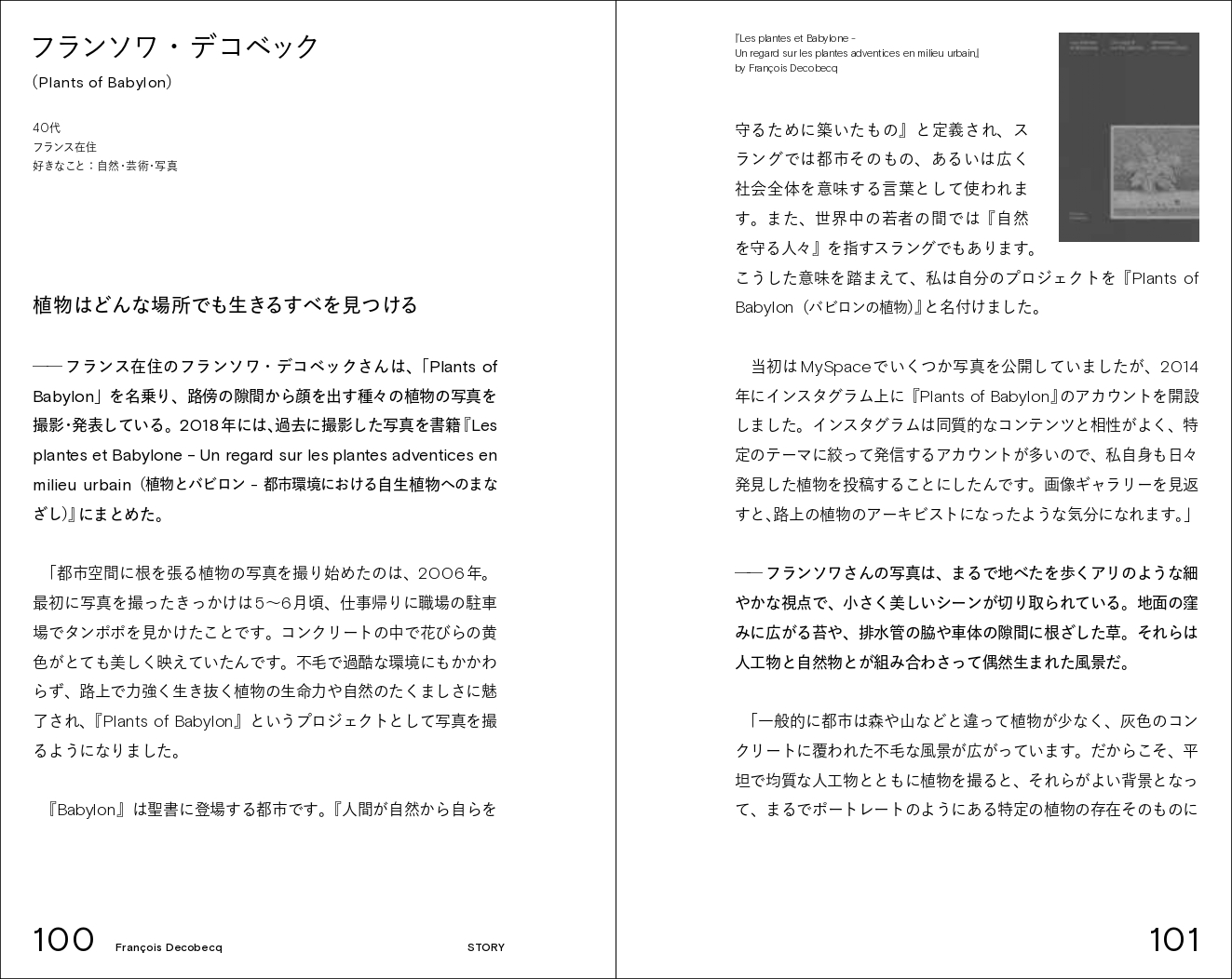 日本、フランス、トルコ、メキシコ、韓国、台湾、イタリア、スウェーデン、ブラジル、シンガポール、アメリカ、オランダ、ニュージーランド。ぜんぶで19人の緑をみる人たち。それぞれのストーリーと総数800枚もの写真をとおしてみえてくるのは、日常にひそむ地球の「野生」だ。