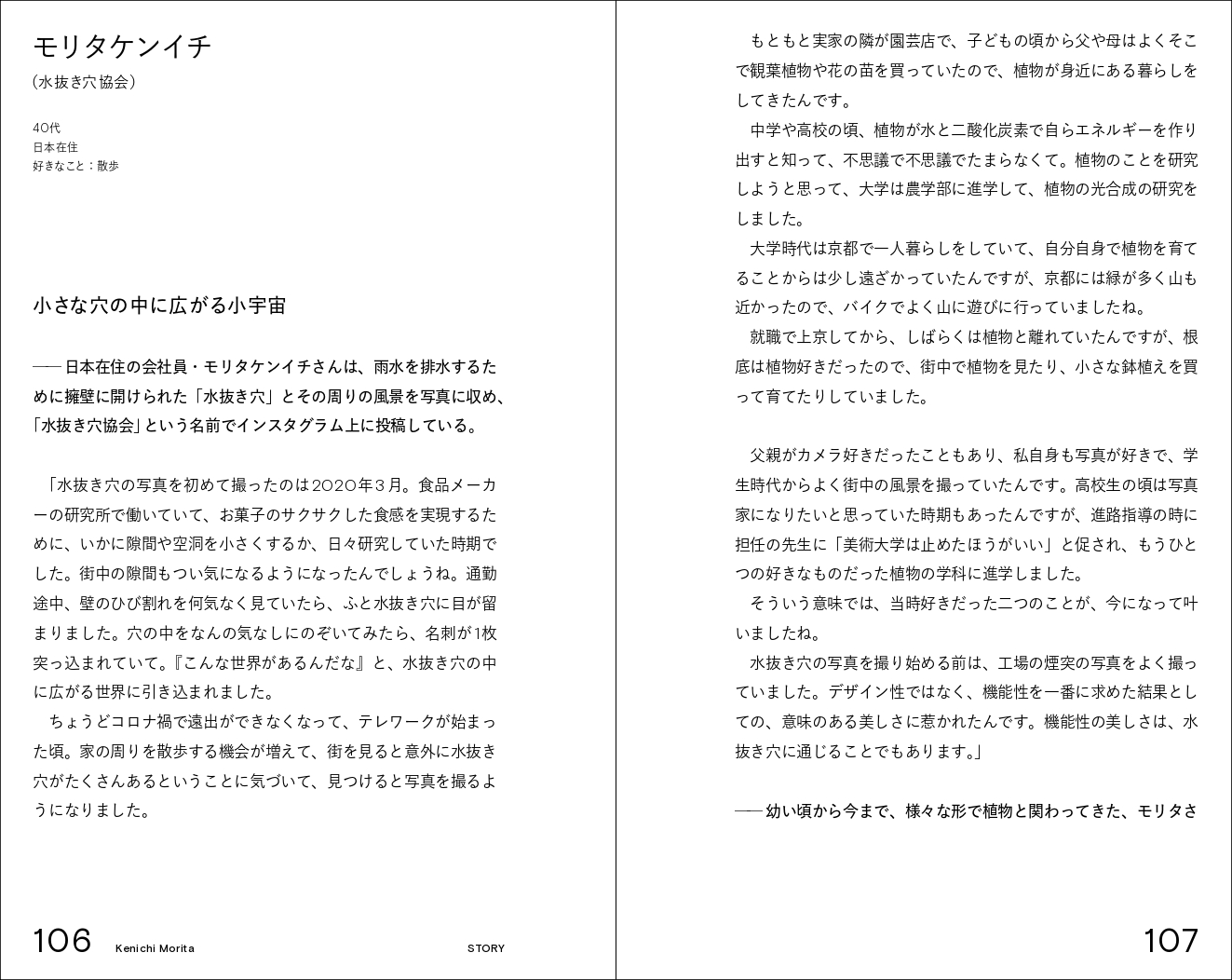 水抜き穴協会・モリタケンイチは、水抜き穴という小さな穴に広がる生態系に「小宇宙」をみる。