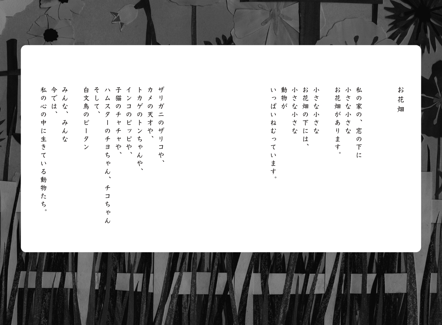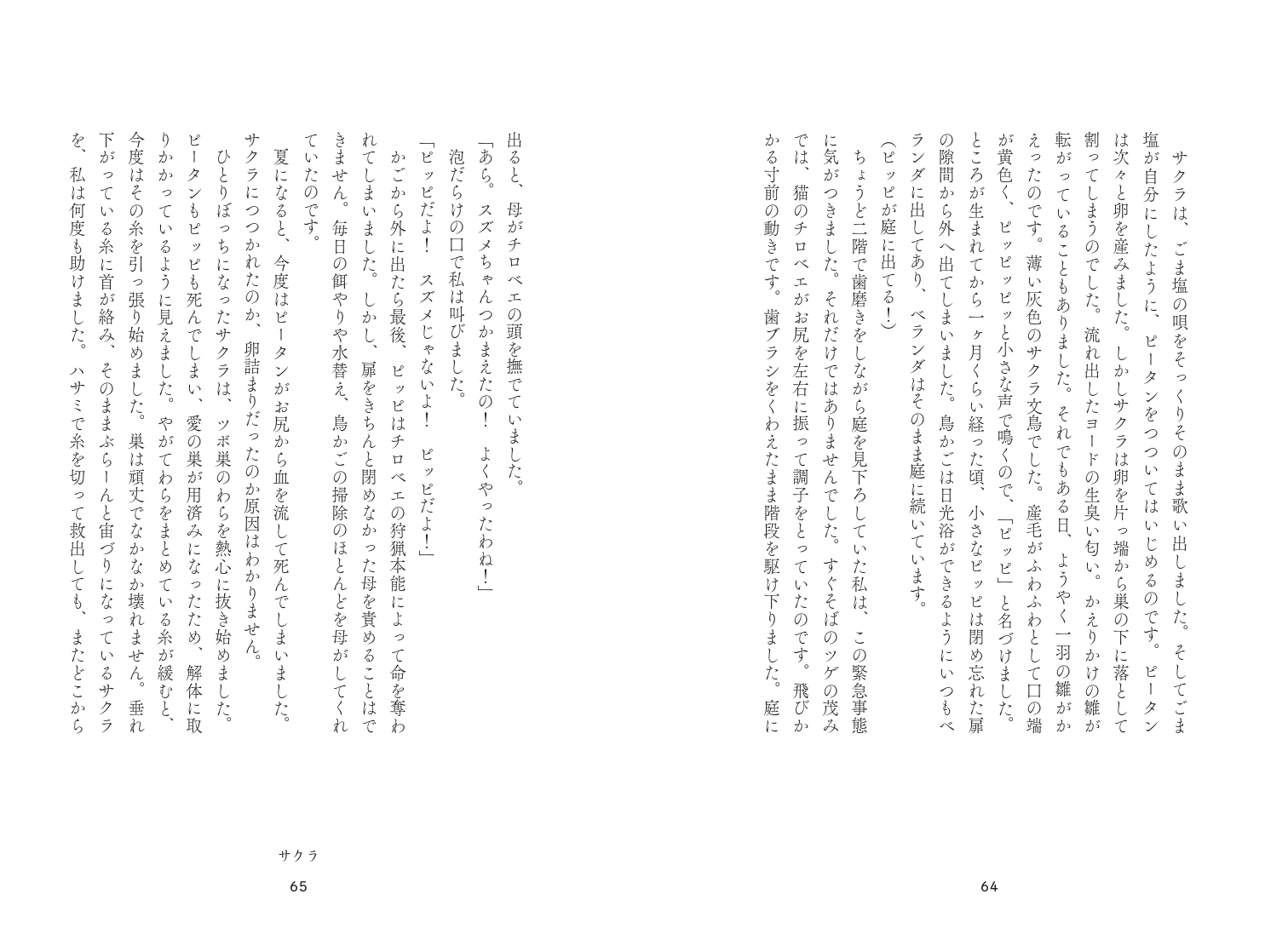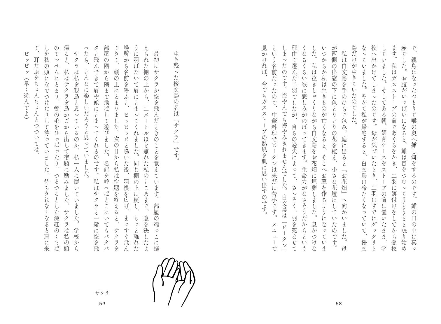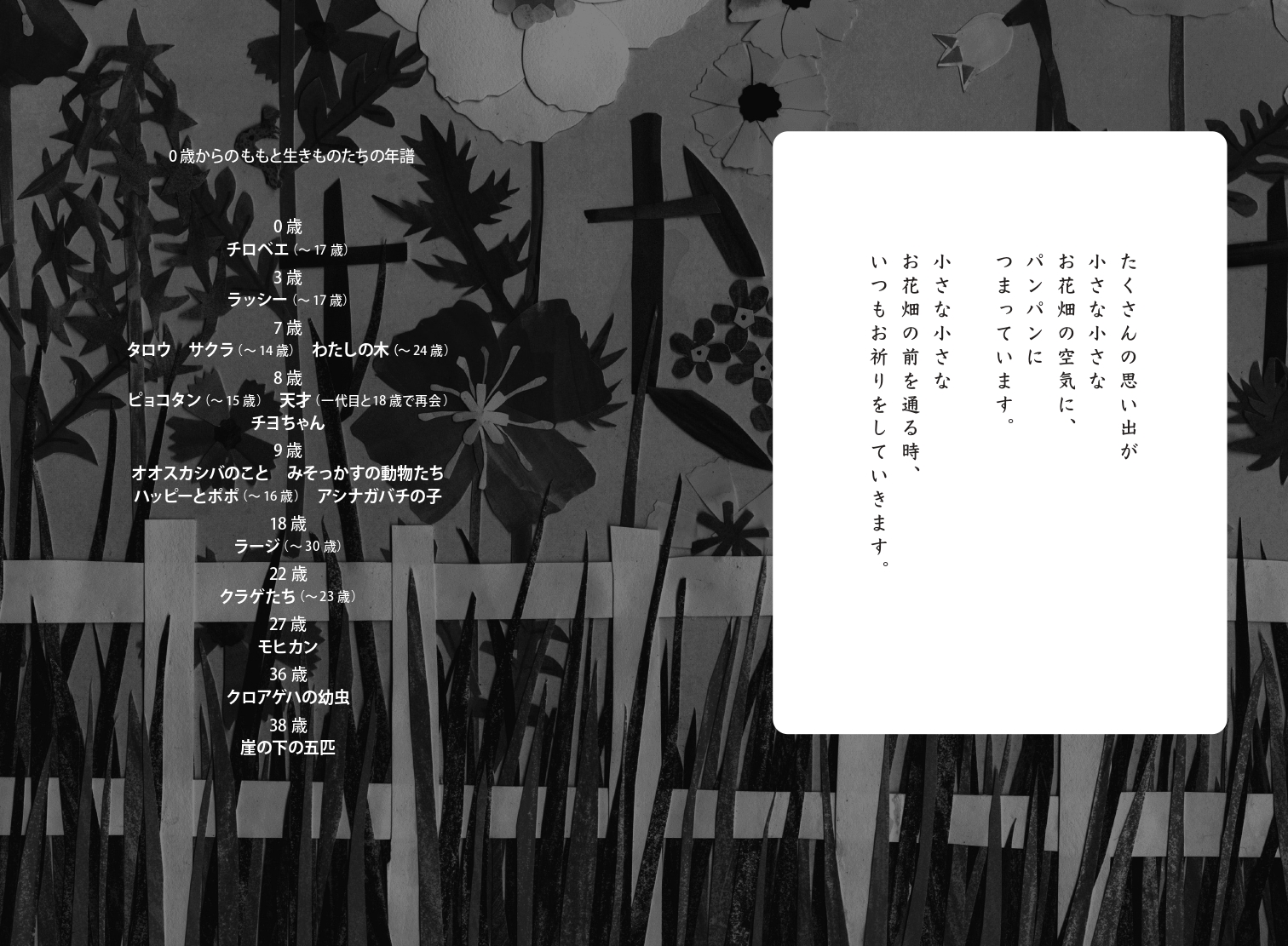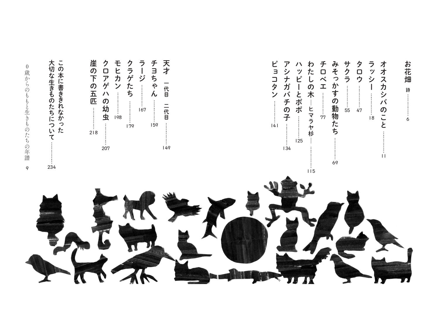 生まれたときからそばにいた猫「チロベエ」。3歳のときニューヨークで飼い始めた犬の「ラッシー」。7歳のクリスマスにねだった文鳥の「サクラ」。9歳で初めて飼育したイモムシ「オオスカシバ」。22歳のとき恋に落ちた「クラゲたち」……。