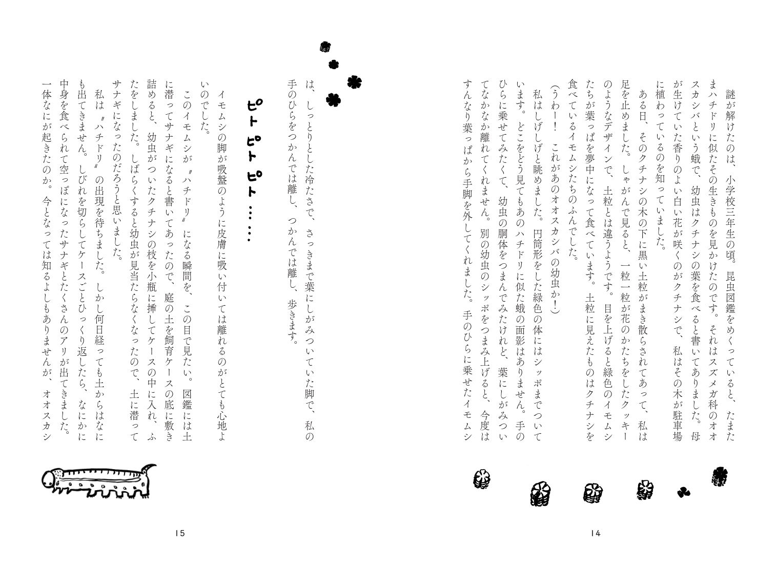 細密に描写する日本初のイモムシ画家として、作品集『わたしはイモムシ』(工作舎)などで知られる著者。彼女の本名は桃子。2歳からニューヨーク州に暮らし7歳で日本へ帰国。幼い頃から生きものが好きで、さまざまな飼育を重ねてきた。