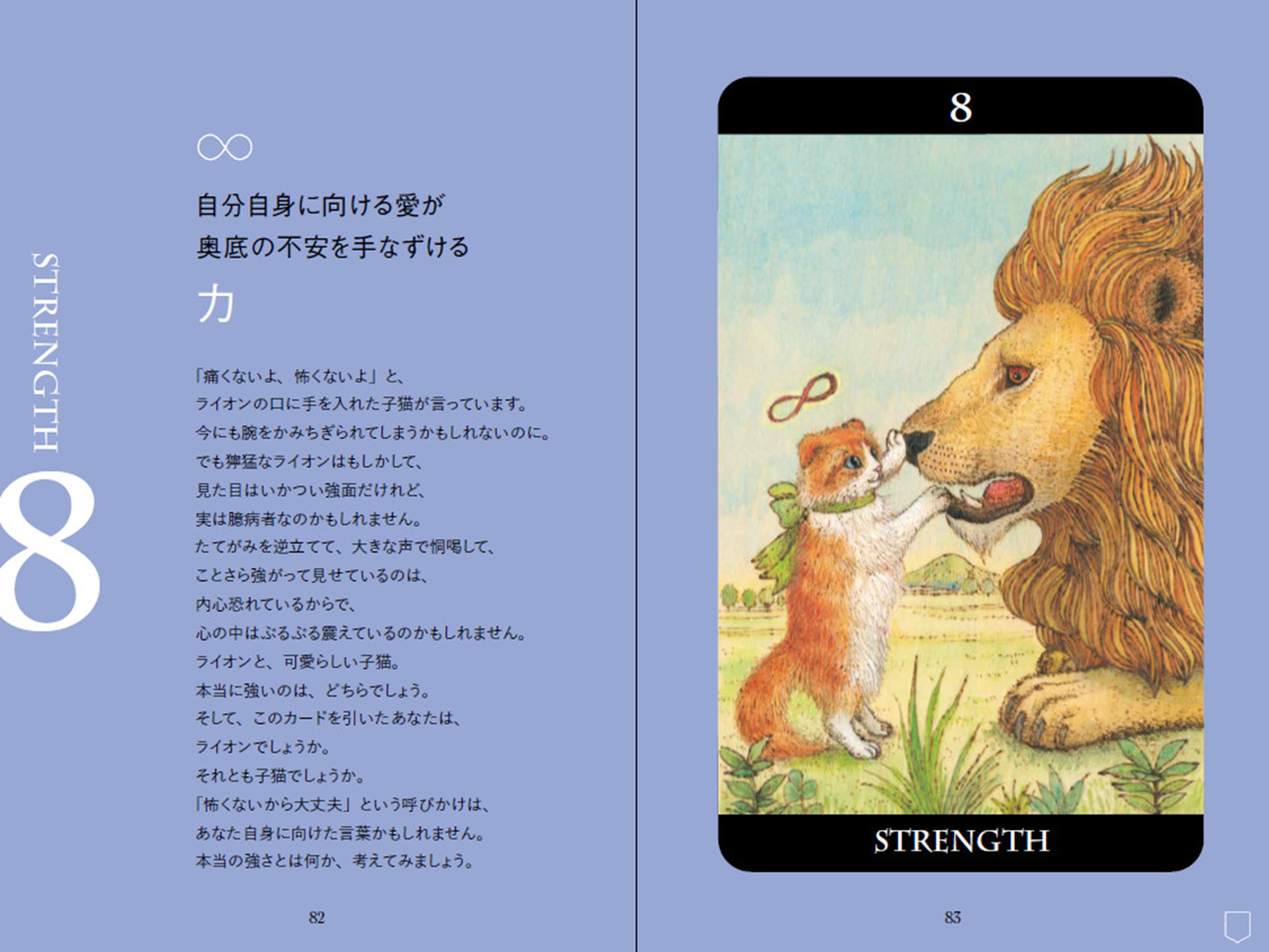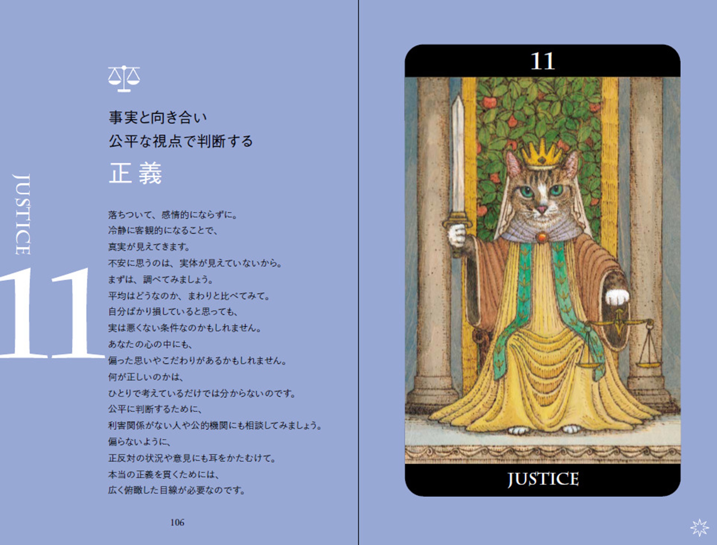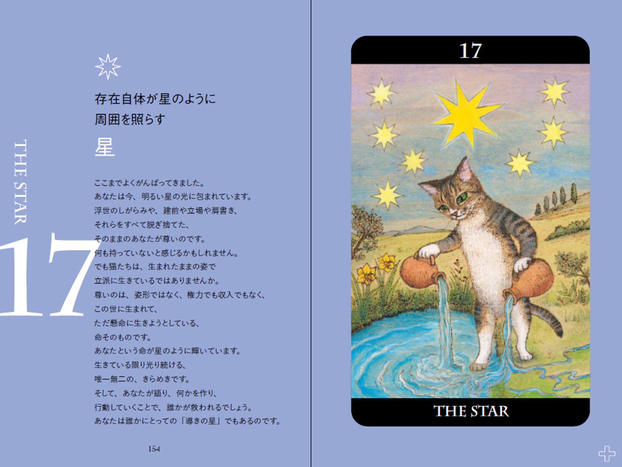 猫野ぺすかさん描き下ろしの猫タロットは、神秘的な温もりと愛らしさを持ち、眺めているだけで心が動かされます。作品集としても楽しめて、お守りのようにそばに置きたくなる本です。
